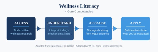 Wellness Literacy is the capacity to access, understand, appraise, and apply evidence-based wellness information to make informed, non-clinical health decisions.